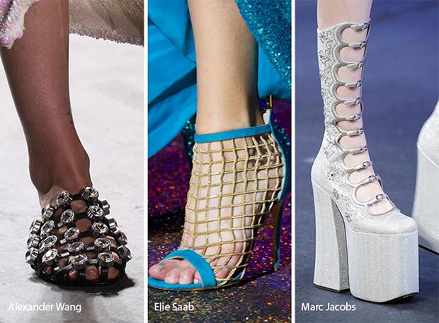 Ми бачимо особливо багато чобіт і черевиків, які дозволяють ногам дихати за допомогою дизайну з отворами або у вигляді сітки. Ми навіть спостерігали крокси протягом усього тижня моди з їх величезними дірками, які дозволяють ногам дійсно «ковтати» повітря. Salvatore Ferragamo приніс тенденцію на монохроматичний колір поряд з дихаючими черевиками, в той час як чорні мереживні чоботи-шкарпетки Dolce & Gabbana ступили по модному подіуму, з абсолютно казковим зовнішнім виглядом.