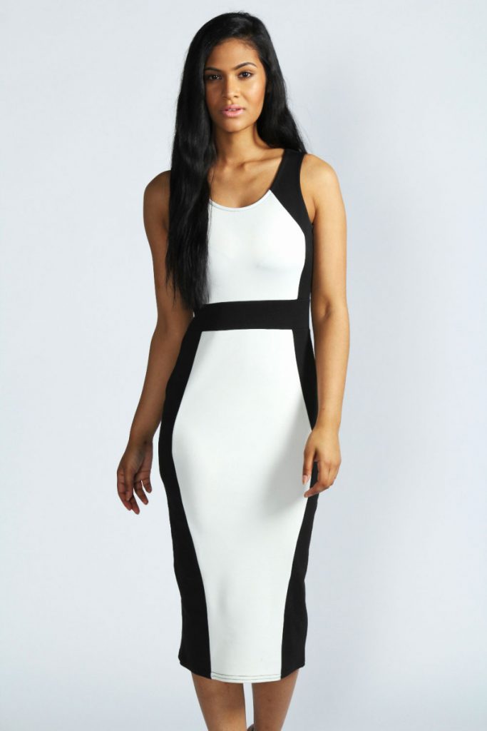- Якщо основний колір йде вертикально по центральній частині сукні, а другий, контрастний — з обох сторін по боках, то такий прийом — відмінний спосіб зробити візуально фігуру більш худий і витягнути силует по вертикалі. Цим прийомом часто користуються зірки, надягаючи подібне плаття «в підлогу» з красивої тканини. Часто можна побачити подібний варіант в такому колірному виконанні: чорний або інший темний колір — по центру, а по боках — білий або тілесний. Це поєднання кольорів створює ілюзію стрункої фігури, тому особливо підходить для повних дам.