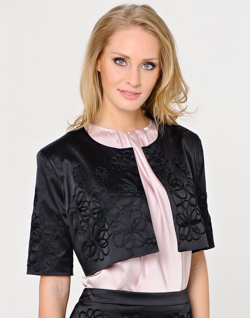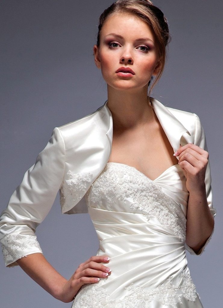 Класичний весільний варіант в стилі мінімалізм — біле болеро з атласу без декору. Воно виглядає дуже красиво і елегантно завдяки самої тканини.