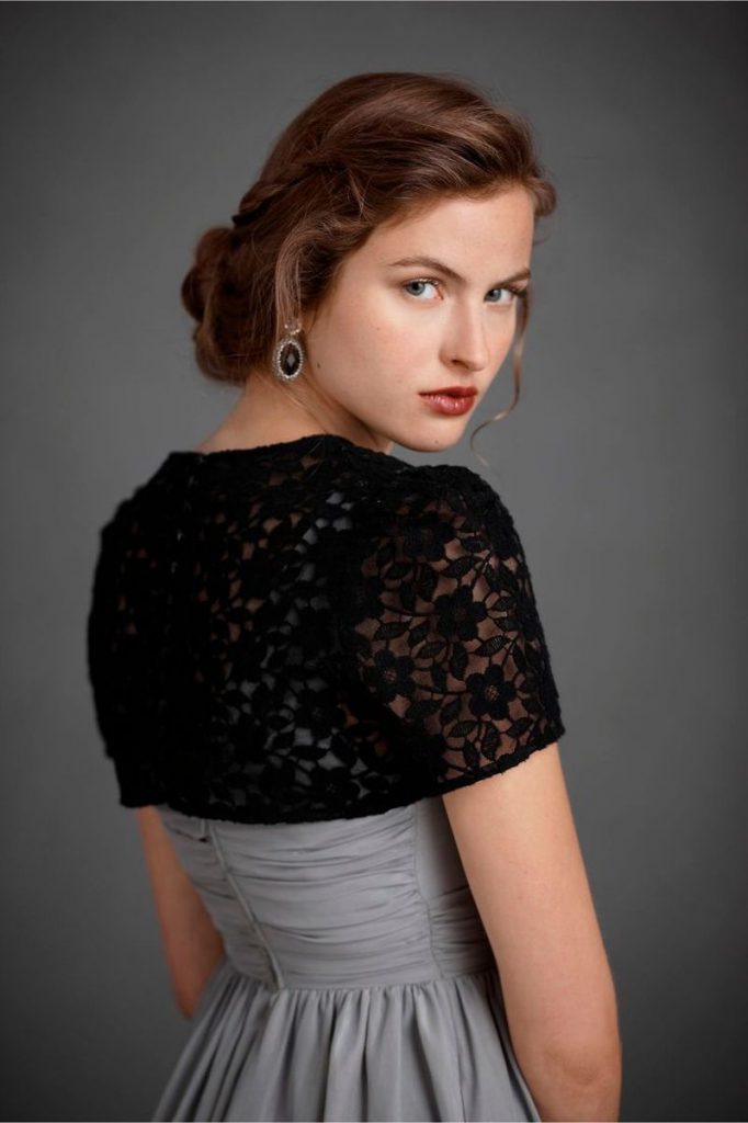 Літній гіпюрову болеро з довгим рукавом доповнить сукню з відкритими плечима. Цікавий варіант — ажурна пелерина з гіпюру і мережива, яка одягається через голову.