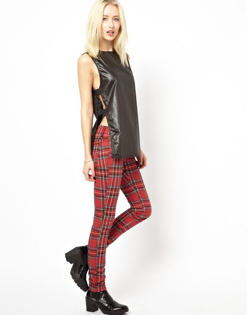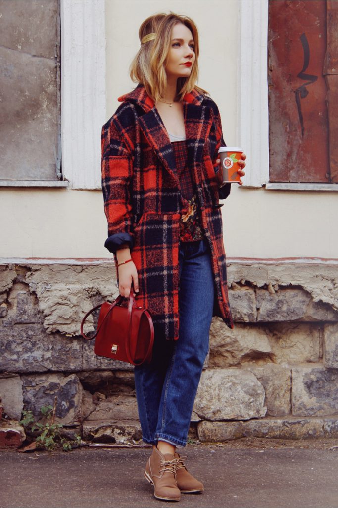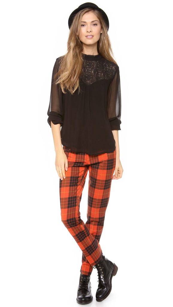 - До штанів в шотландську клітку можна підібрати блузу, светр або жакет такого ж відтінку, як і основний колір орнаменту. Якщо «низ» буде стриманий, то «верх» можна носити яскравіше, і навпаки. Така легка гра з відтінками допоможе зробити виразніше однотонний образ.