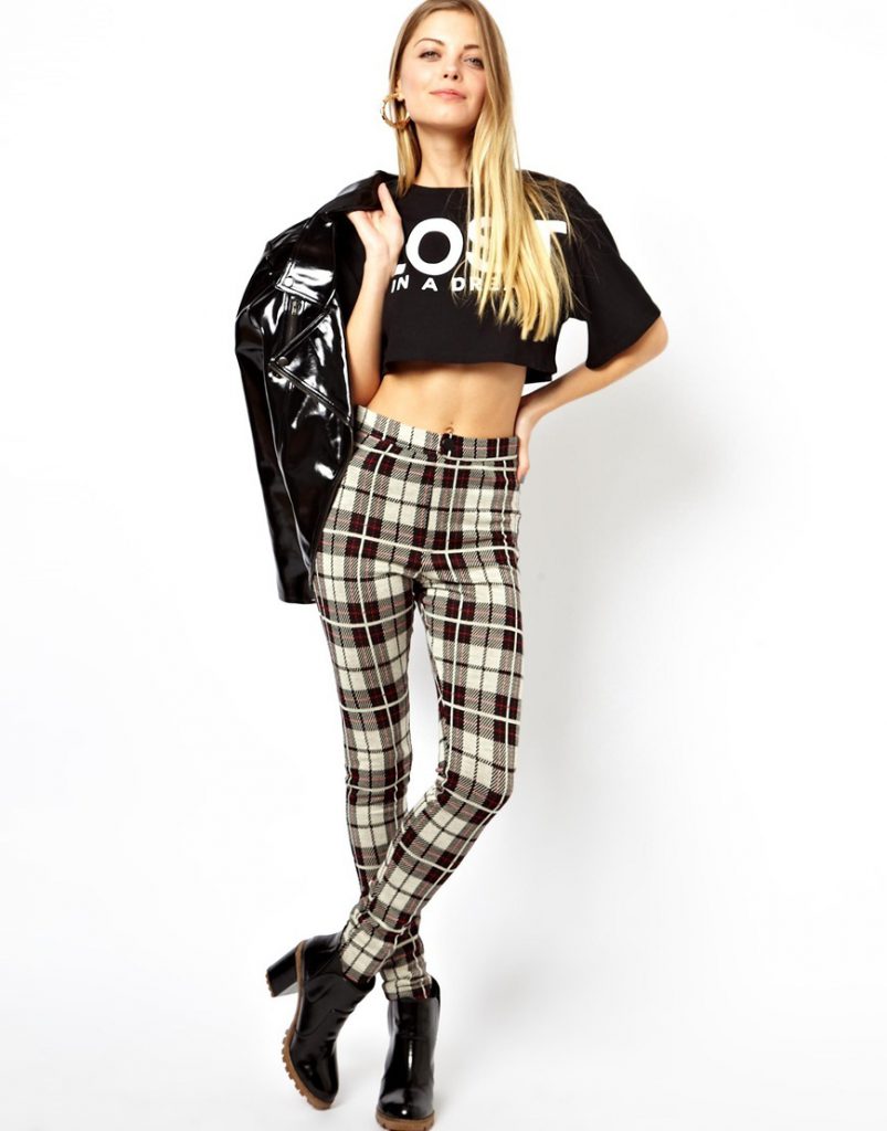Оскільки клітина — це головний акцент в образі, щоб не перевантажити його, важливо правильно підібрати інші елементи одягу. В залежності від обраного вами стилю, можна носити модні штани з різними «верхи» і взуттям.