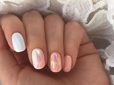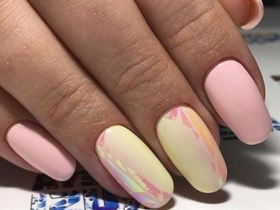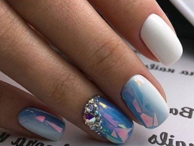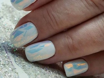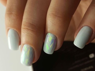 Переважна більшість асоціює цей дизайн з хижими «осколками» і темними кольорами. Але «бите скло» може бути і ніжним, якщо посадити шматочки фольги на прозору, градієнтну або нюдовую базу, а решта нігтики заповнити білим або оформити френчем.