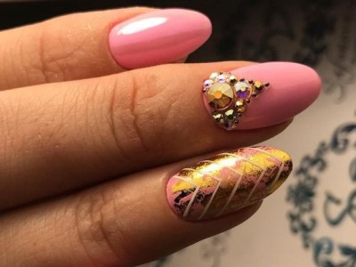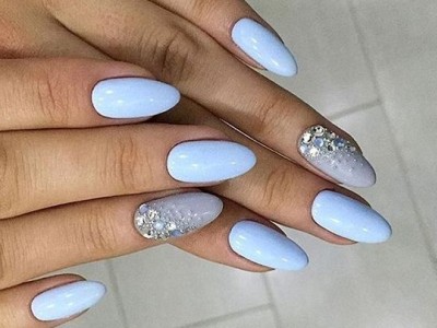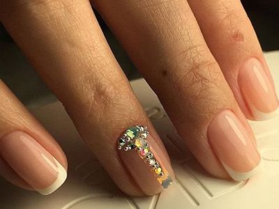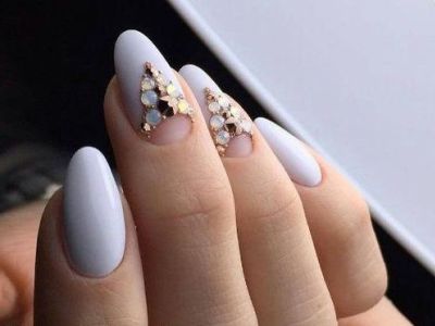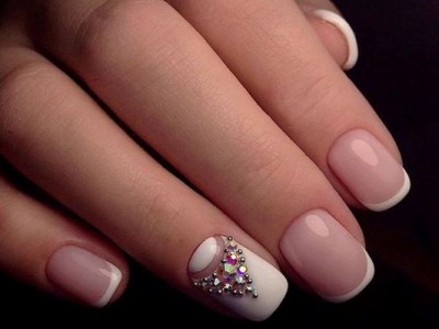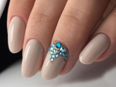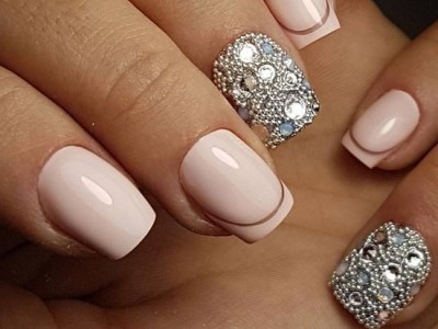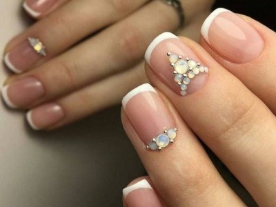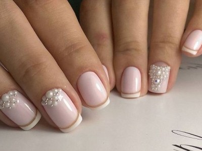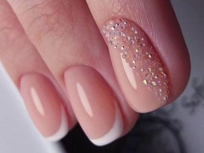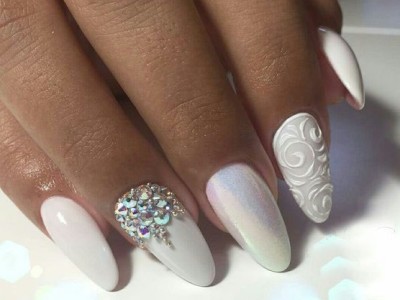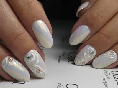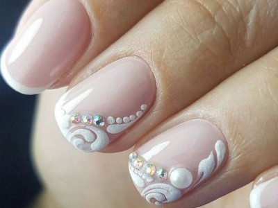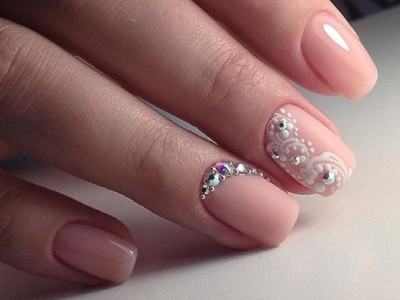 Камінчиками викладають лунки або окремі композиції – вишуканою буде лінія з страз, обвідна кутикулу. Під забороною тільки повністю вкриті камінням пластини, це для наречених занадто громіздко і навіть вульгарно. Зате неймовірно вишукано виглядає колечко з камінчиків на нігті. Замість страз можна взяти декор у вигляді перлів або напівдорогоцінного каміння, вони особливо розкішно виглядають, якщо дублюють прикраса. Наприклад, «перлинна» лунка чудово буде гармоніювати з таким же браслетом, а блакитні камінці повторять красу лазуриту на антикварному кольє.