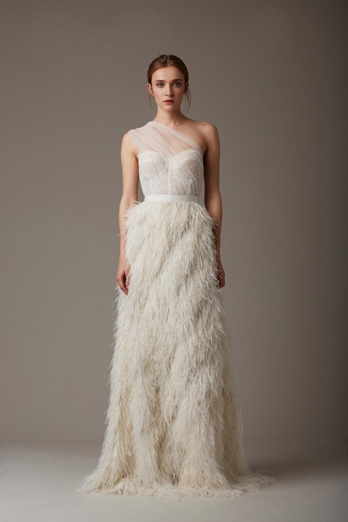 - Весільна сукня марки Marchesa у нинішньому сезоні порадували всіх наречених своїми шикарними сукнями. Дизайнери марки пропонують використовувати такий наряд для зимового весілля — напевно, в додаток до краси, пір’яні сукні виходять ще й теплими. Красиво виглядає з таким сукнею біле коротке хутряна болеро.