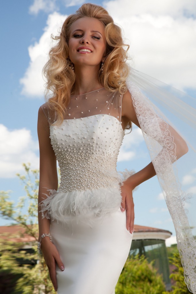 - Весільне плаття, прикрашене пір’ям на спідниці, виглядає по справжньому казковим. Тому якщо ви хочете хоча б один вечорі у свого життя перетворити в казку, сміливо купуйте весільну сукню з пір’ям.