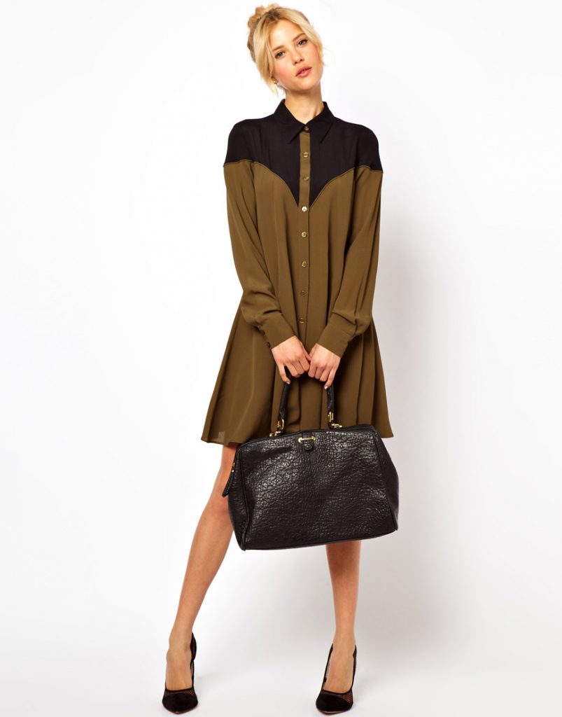 Сукня-сорочка в якості костюма на роботу – цілком підходящий варіант. Тут можна зупинитися на пастельних тонах або кольорі хакі. Пом’якшить образ класична сумка і чоботи осінньо-зимового сезону. Піджак краще не одягати. Якщо сукня-сорочка нижче коліна, то краще пов’язати пояс, якщо коротке, то можна надіти ковбойські черевики і штани.