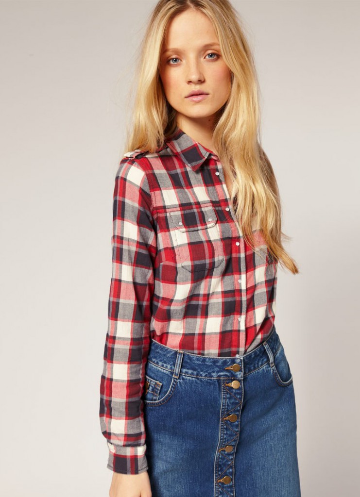 Картата сорочка з джинсової спідницею
