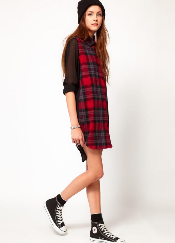 Картата сорочка з короткою чорною спідницею