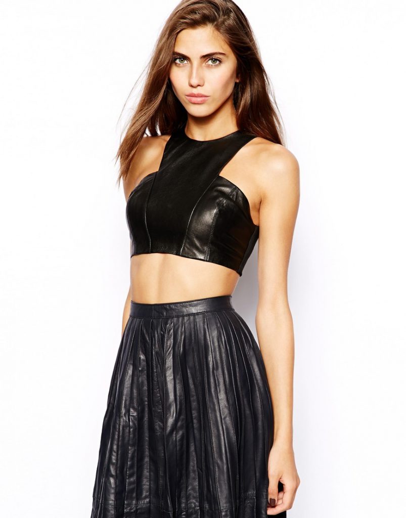 Як і раніше популярні і шкіряні топи. Це так брутально і цікаво. Жіночі топи створені для жінок з ідеальними фігурами й маленькими розмірами. Вони щільно облягають тіло і підкреслюють достоїнства. У шкіряному топі не приховати вад. З таким видом топів чудово виглядають шкіряні шорти або вузькі штани.
