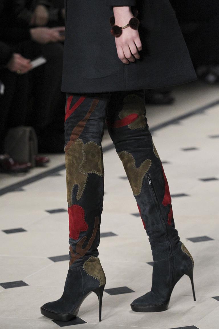 • дуже високі ботфорти з замші або текстилю, який повторює колір і фактуру деяких елементів образу;