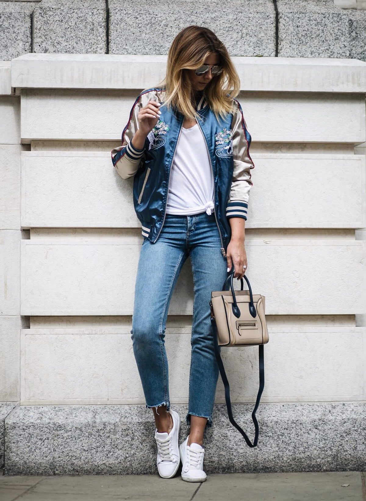 Вибираючи взуття, яка доповнить образ з кофтою-бомбером, сміливо включайте фантазію. Крім кросівок і спортивних черевиків цю вітровку можна носити з елегантними шкіряними оксфордами, ніжними балетками або стильними човниками.