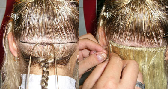 • Спочатку з волосся плетуть дуже тонку косу не більше 1 см шириною. Їх число обумовлюється кількістю волосся – чим вони густіше, тим більше кісок знадобиться. Завершальним етапом стає пришивання накладних волосся. Воно виконується за допомогою товстої голки з тупим кінцем, не травмуючим шкіру. Пришивають пасма по всій довжині коси.