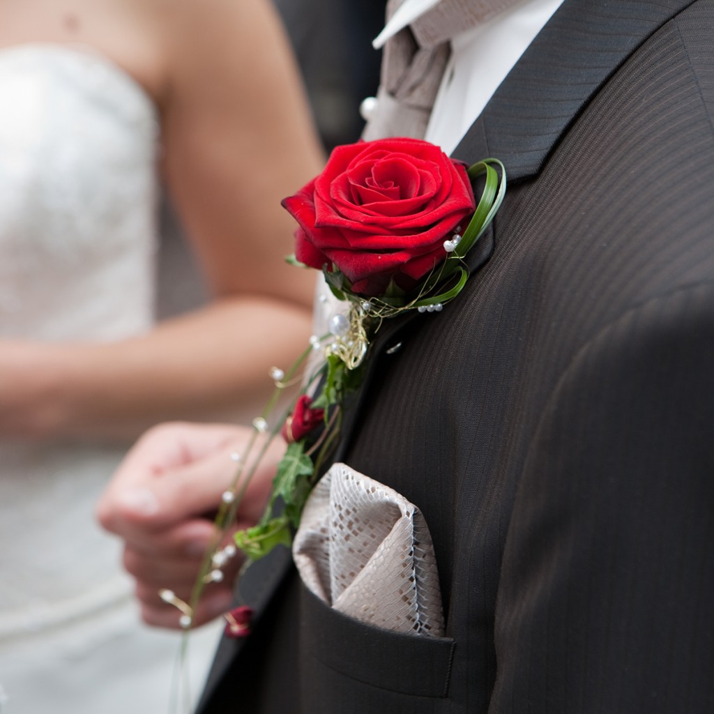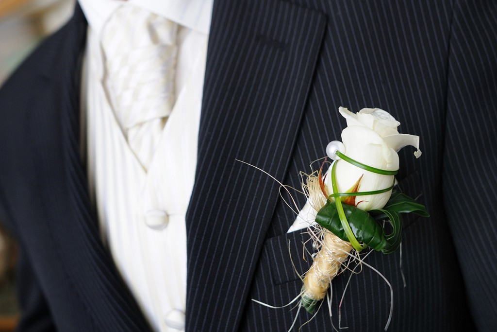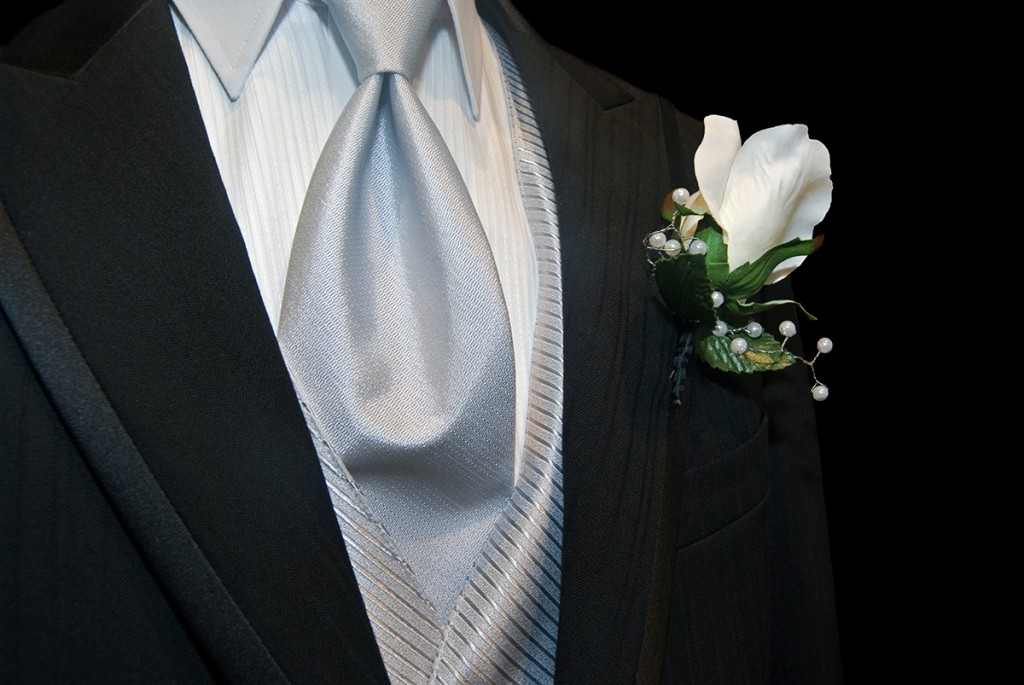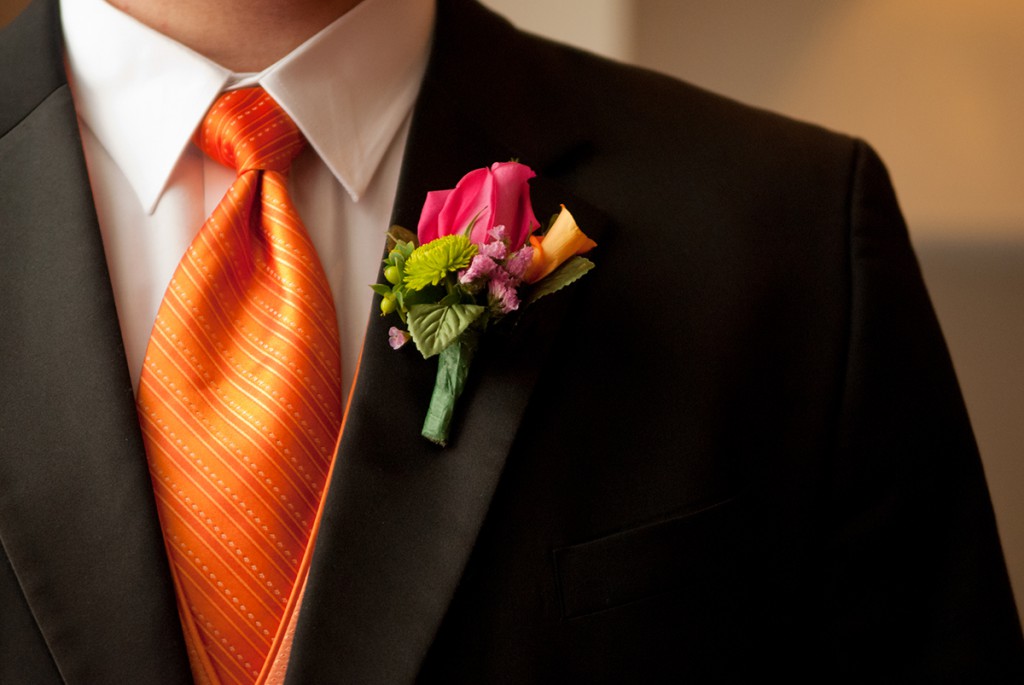 2. Деякі чоловіки вибирають елегантні бутоньєрки замість нагрудного хустки. Подібний аксесуар обов’язково стане ефектною деталлю костюма нареченого. В цьому випадку можна використовувати копію весільного букета нареченої або оригінально оформлений квітка в яскравому забарвленні. Дуже важливо, щоб бутоньєрка відповідала кольором краватки, а сам краватку був яскравим. Альтернативою бутоньєрці може послужити помітна шпилька на лацкан.