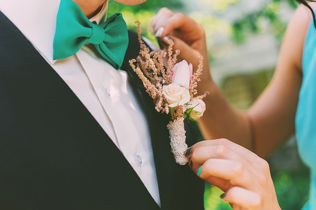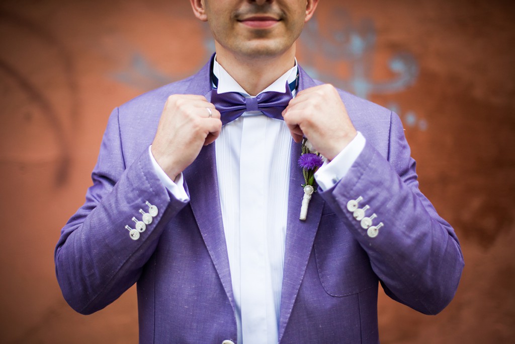 5. Краватка слід підбирати в тон костюму, якщо він незвичайний. У разі якщо весільний костюм темний (темно сірий або чорний), то краватка вибирається під колір букета або в тон кольорових елементів весільного плаття. Якщо буде не класичний краватку, то варто подбати про те, щоб плаття нареченої мало схожі елементи. Надягати або не одягати краватку і метелика – рішення приймається від типу сорочки, а також піджака.
