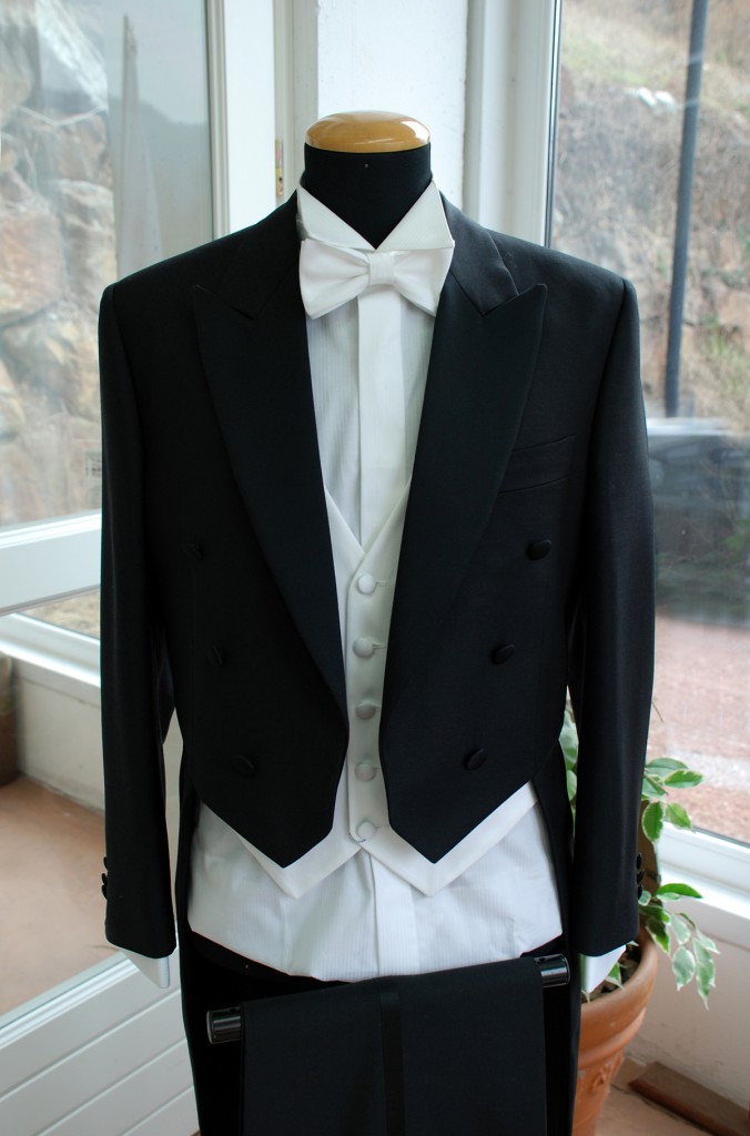 4. Фрак – найбільш урочистий і формальний варіант костюма на весілля. Тут пред’являються такі ж правила, що і зі смокінгом, проте обов’язковий білий жилет, а замість чорної метелики біла.
