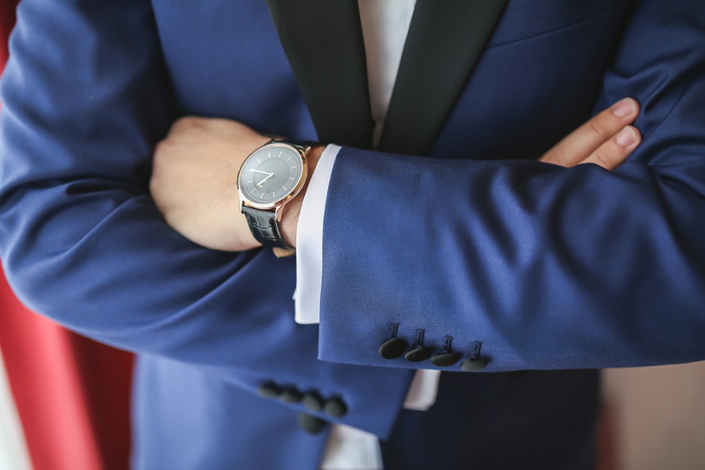 4. Годинники можуть стати ефектним аксесуаром для костюма на весілля. Однак якщо в повсякденному житті Ви носите командирські, спортивні, електронні, ультрасучасні годинник екзотичного дизайну, то їх слід залишити вдома. До весільного костюма найкраще підійдуть стрілочний годинник в класичному дизайні, з металевим ремінцем з жовтого металу. Подібні годинники будуть чудово контрастувати з темним костюмом, а також ідеально поєднуватися з позолоченим галстучным затиском і з кільцем.