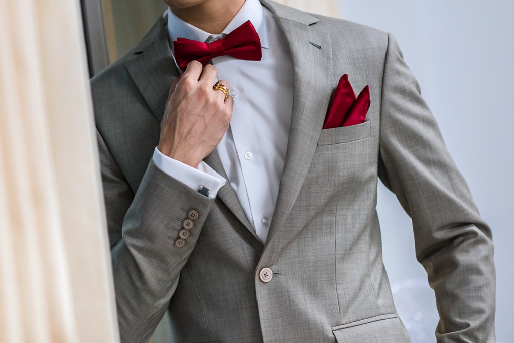 Сірий костюм нареченого на весілля з червоними аксесуарами