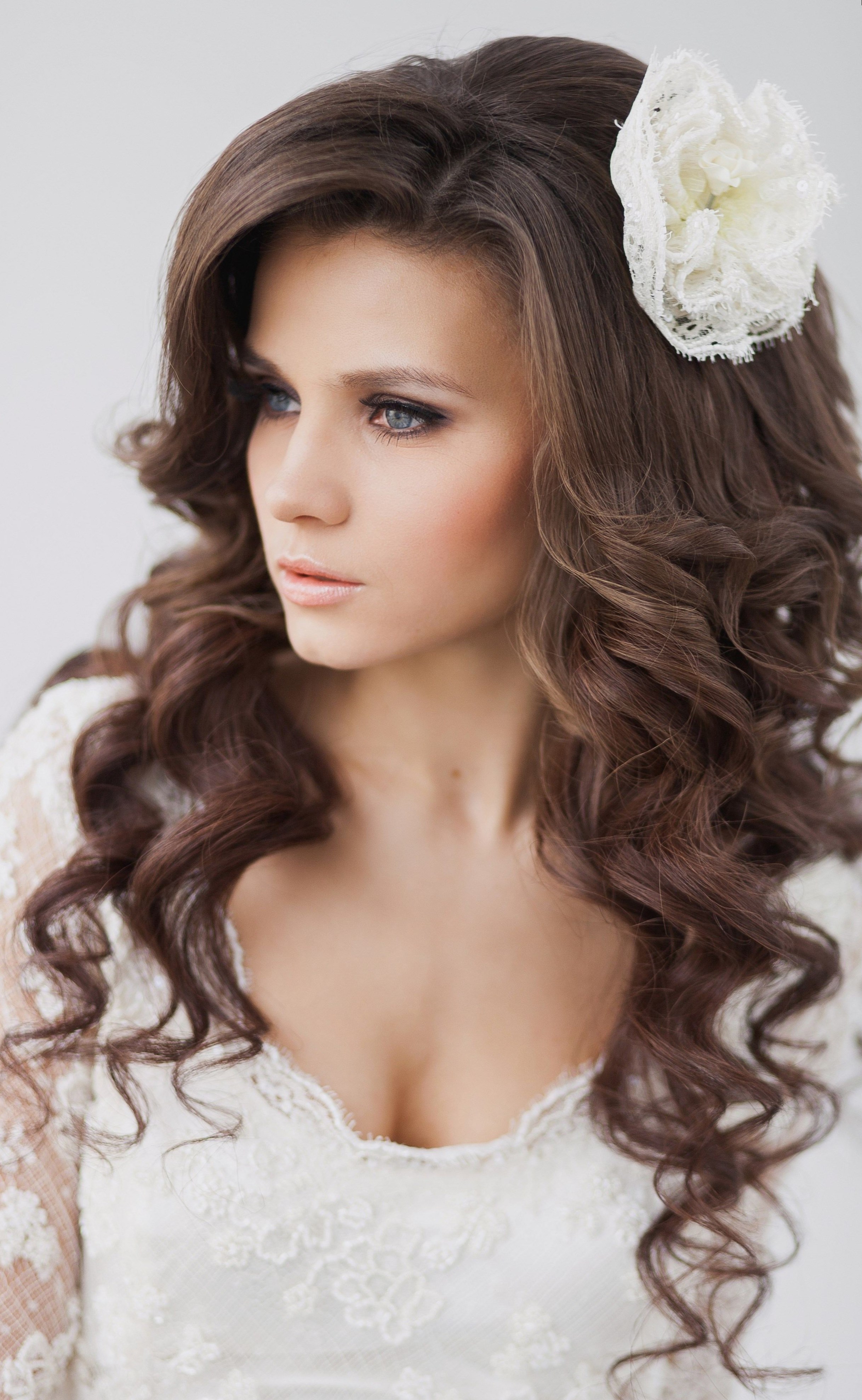 Зачіска у романтичному стилі завжди виглядає легко, легко і невимушено. Досить часто вона прикрашається не фатою, а однією квіткою, стразами,