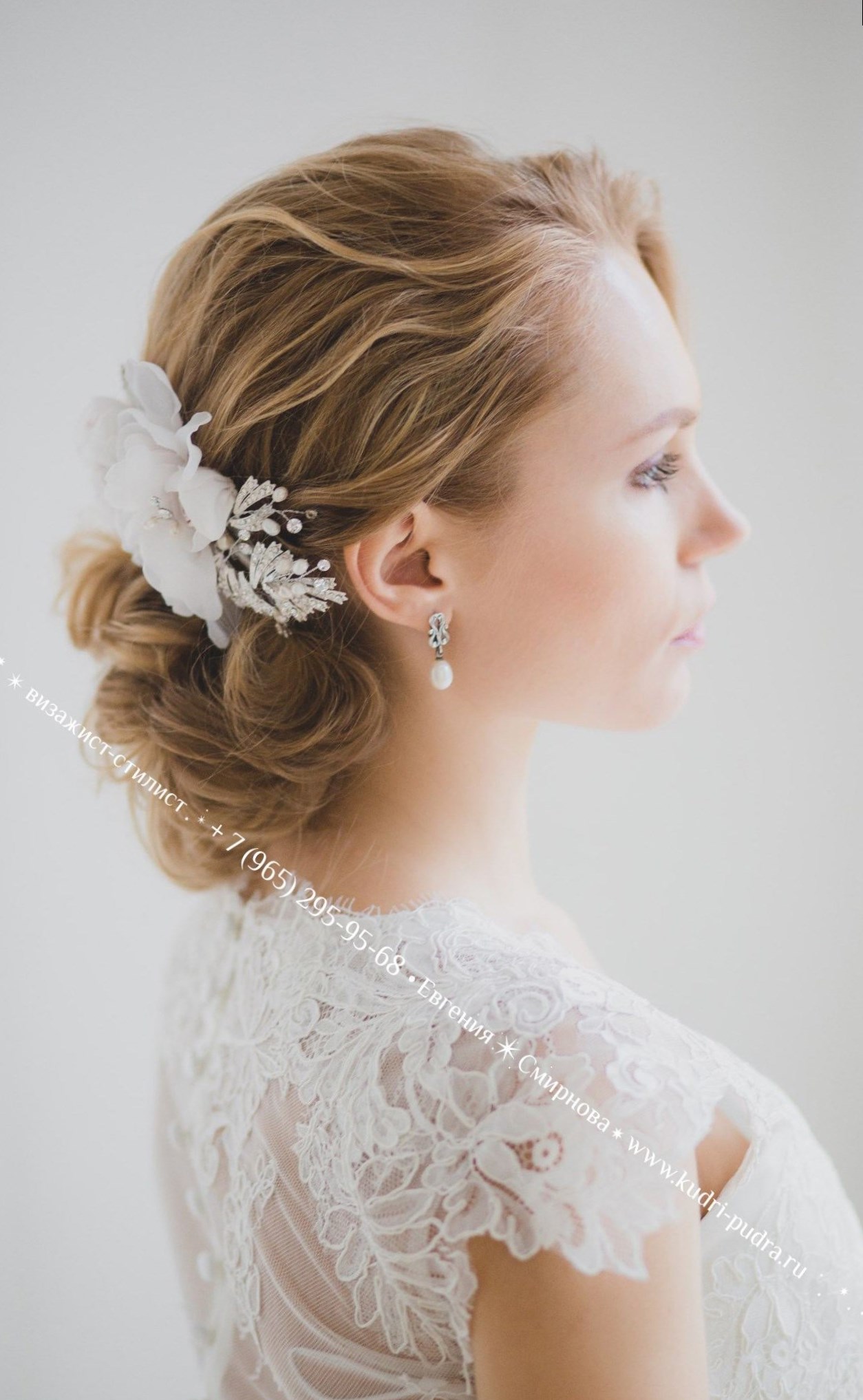 Ніжний злегка недбалий пучок для весільної фотосесії нареченої Марії. Весільні зачіски та макіяж, Євгенія Смирнова, Фрязіно. Весільний фотограф Лариса