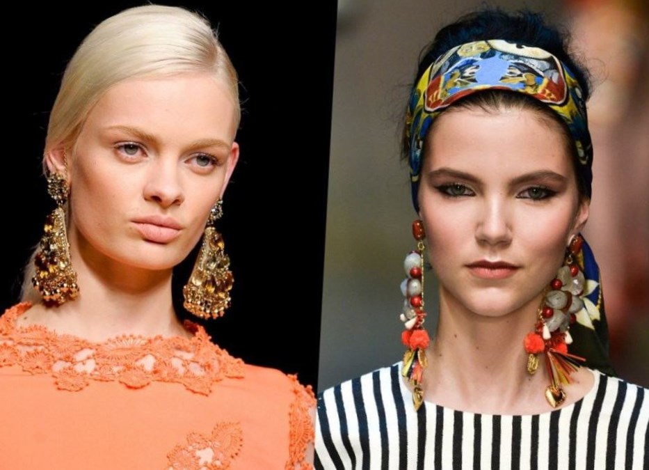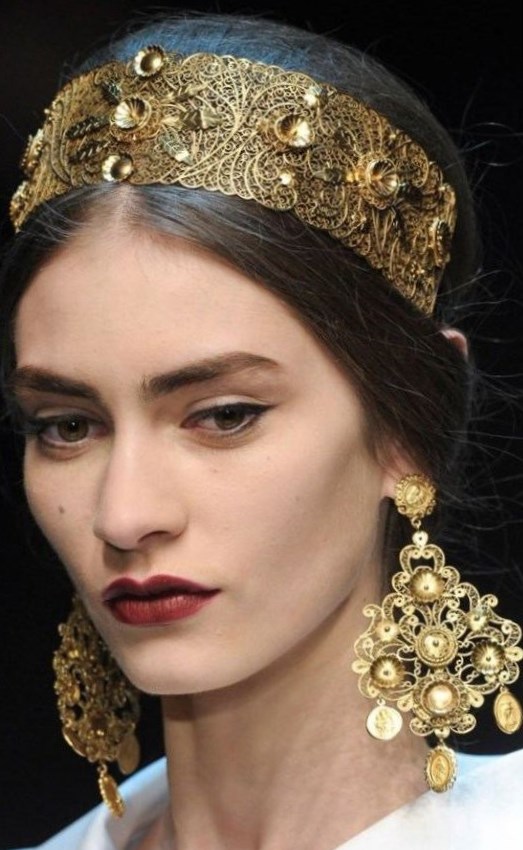 Нас просто зачарували розкішні, позолочені пов’язки для волосся з дорогоцінними каменями в поєднанні з масивними круглими сережками.