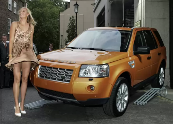 Легку шовкову сукню з мінімалістським кроєм підносить всі достоїнства Шарапової: стрункість, крихкість, довгі ноги, точений силует. Блиск тканини і золотистий відтінок чудово підкреслюють засмаглу шкіру дівчини. Білі туфлі на платформі і з височенною шпилькою надають зухвалості, гідною жовтого Land Rover.