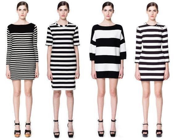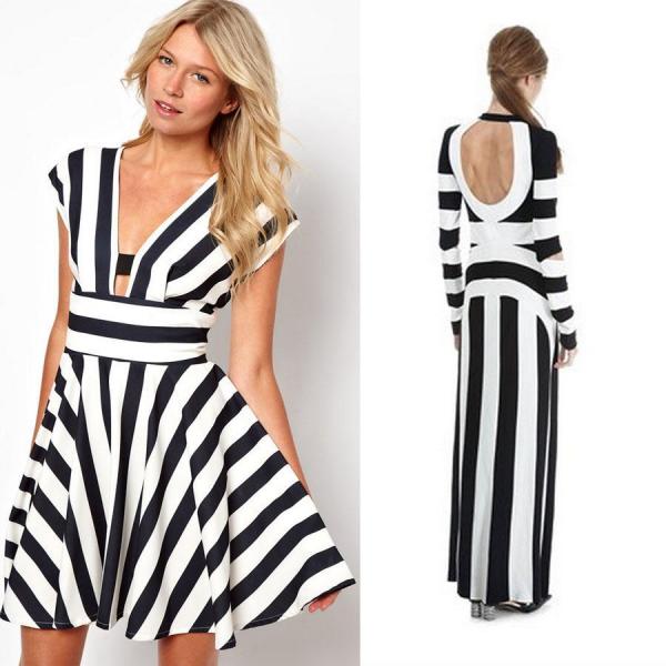 У двоколірному плаття в смужку ви можете бути дуже спокусливі, будь воно коротке або довге, з симетричним або асиметричним малюнком. Надіньте туфлі на високих підборах, балетки або сандалі і будете виглядати приголомшливо. Ще більш сміливим буде поєднання сукні з пальто червоного кольору.