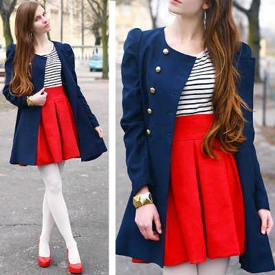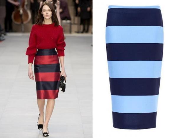У гардеробі кожної з нас є футболка або топ в горизонтальну смужку. Шикарним ансамблем буде комбінація топа з красивою червоною спідницею і синім пальто, а смужки згладять контраст між червоним і синім кольором.