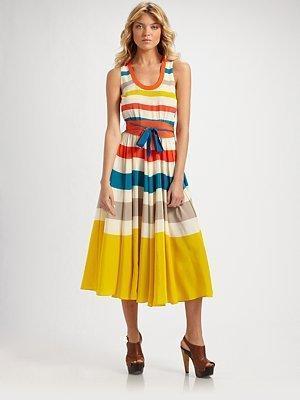 Плаття в смужку в будь-якому стилі і з будь-якої тканини ідеально підходить для літніх прогулянок або вечірок. Погляньте на це плаття на фотографії. Зшите з красивою тканини, воно має жіночний силует, вдалу довжину і струмує спідницю; його можна носити як з сандалями, так і туфлями на підборах, — у будь-якому випадку ви будете виглядати абсолютно сенсаційно. У міжсезоння ввечері поверх плаття можна одягти кардиган або жакет.