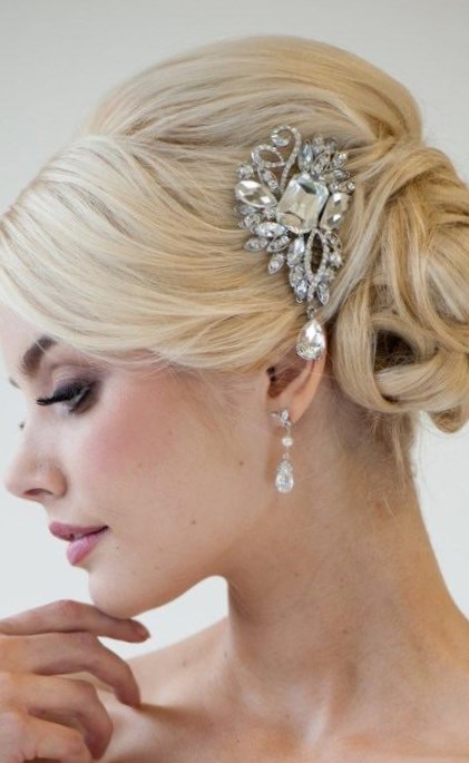 Прикрасити таку весільну зачіску можна розкішної шпилькою з каменів. Щоб образ нареченої був більш романтичним, волосся в хвості можна завити на великі