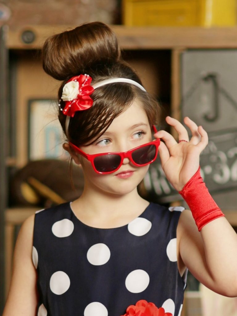 На маленьких модницах будь-які дорослі варіанти зачісок 50-х виглядають мило. Якщо дитячі волосся дуже тонкі, використовуйте бублики і шиньйони. І, звичайно, жодна маленька «стиляга» не обійдеться без яскравих бантів, стрічок і ободків.
