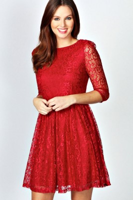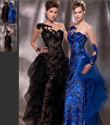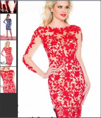 Довжина сукні — трохи нижче коліна. Але таку скромність з лишком компенсує тканина: легкий тюль з елементами мережива здається прозорим і створює ілюзію оголеного тіла. Але бежевий підклад не дає розгледіти більше, ніж дозволяють пристойності. І від цього плаття виглядає дуже ефектно. Обидва кольори — червоний і синій — підійдуть для Різдвяного вечора.