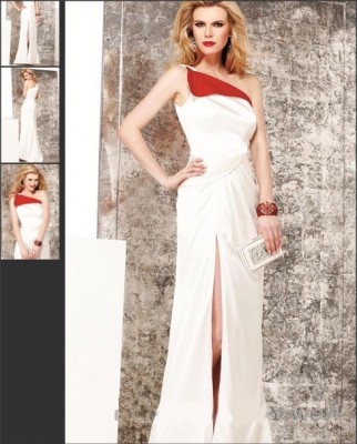 Молочна білизна цієї сукні була б просто нудною класикою. Якби не червоний відворот верху. Він настільки контрастує з рештою нарядом, наскільки ж і гармонує з ним. Особливо, якщо ви доповніть образ червоним браслетом або туфлями.