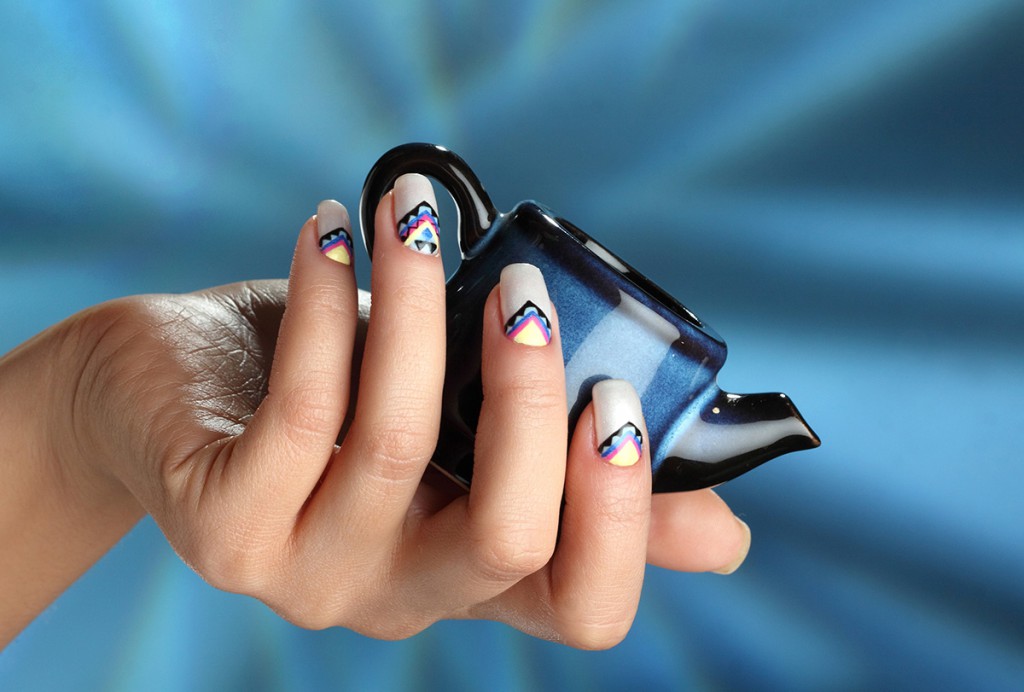 Рада, як не пошкодити поверхню скотчем: перед наклеюванням смужки зі скотчу на ніготь, пару раз приклейте її на тильну сторону кисті і вимк. Можна малювати горизонтальні, вертикальні, діагональні смужки або зигзаги. Наприклад, взяти 4 пастельних відтінків – блакитний, білий, помаранчевий, зелений – і намалювати ними 4 діагональні смужки на кожному нігті. Виглядає дуже красиво.