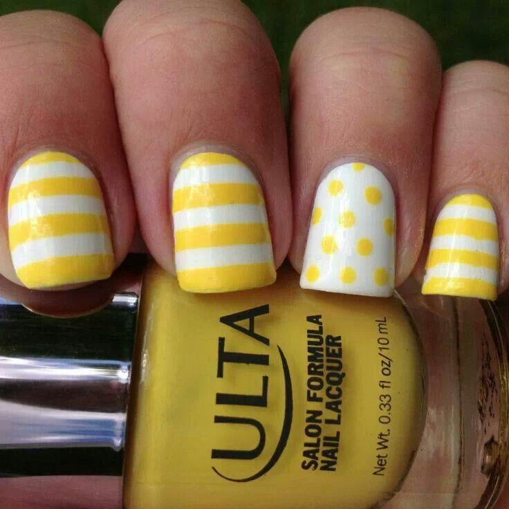 Ще один варіант смугастого дизайну – смугастість в одній колірній гамі. Наприклад, можна зробити лимонний манікюр. Покрити всі нігті світлим відтінком жовтого. А потім, використовуючи трафарети зі скотчу, зробити візерунки більш світлим або темним, жовтим. По-літньому і радісно виглядає такий дизайн, не буйствующий фарбами, але різний на кожному пальці. Один ніготь можна залишити без візерунка, на іншому намалювати одну вертикальну смужку, на іншому дві діагональні, на третьому трикутник і так далі, слідуючи за фантазією.
