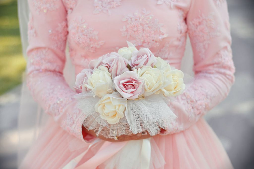 Рожеве весільне плаття може виглядати по-різному. Для любительок романтики відмінний варіант – пишна сукня кольору рожевий кварц, в тон букету троянд. Більш суворі натури можуть вибрати білу сукню з блідо-рожевим відтінком і букет з рожевих або білих тюльпанів.