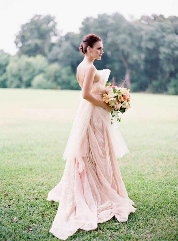 Легкі, повітряні, пишні шари довгої спідниці ніжно-рожевого кольору одразу перетворюють весільну церемонію в сцену з костюмованого фільму.