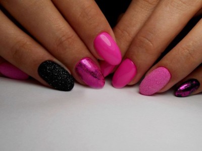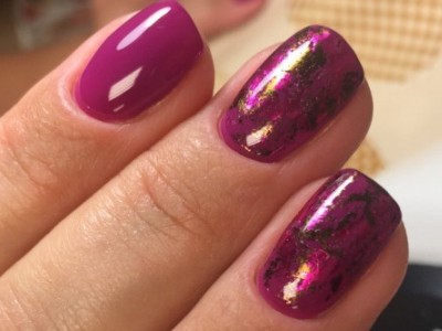 У наборі обов’язково буває шматок фольги рожевого кольору. Активно його використовувати на будь-якому спектрі фарб! Чудово поєднання чорного лаку і рожевого «скла».