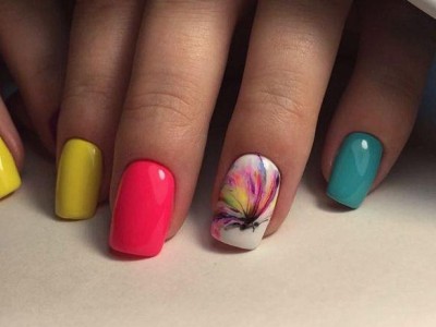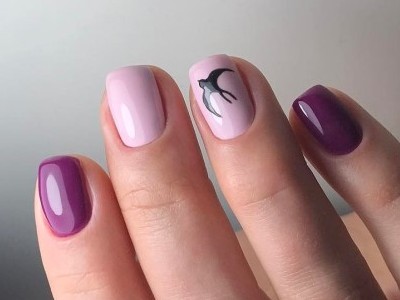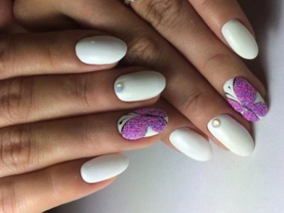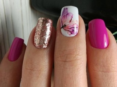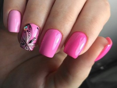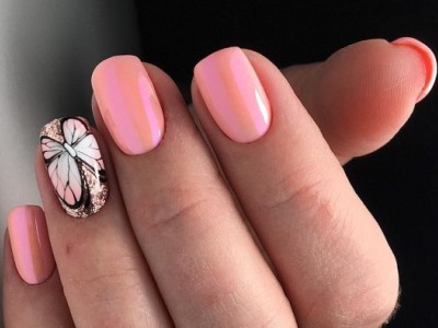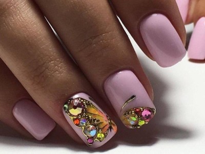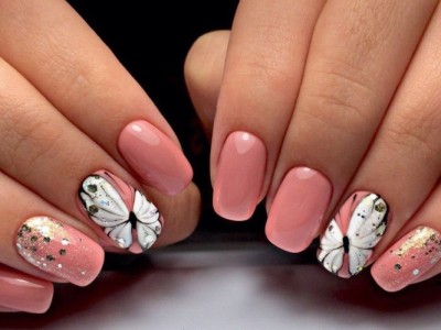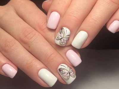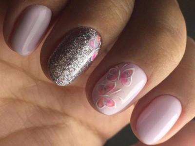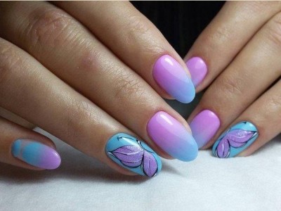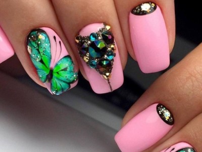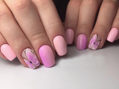 У літній час крилаті чудесницы злітаються в манікюрні салони, а звідти – на жіночі ручки. Півонії, троянди, гвоздики для них – сама солодка приманка. Тому і в нейл-дизайні метелики красуються в основному на рожевих тонах. І не соромтеся у вираженні своєї фантазії і декорі. Крила прикрашайте «битим склом», блискучими камінчиками, бульонками і подвійні. Чарівне рішення – рожево-блакитний градієнт на крильцях або хоча б сусідніх нігті.
