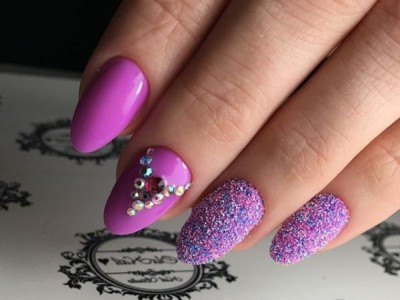 Приблизно за таким принципом працює і техніка з блискітками. Їх можна втирати і просто посипати – на липкий шар і те, і інше лягає відмінно. Блискучий дизайн завжди оригінальний. Ними роблять акцент на лунулах, покривають цілком один з нігтів, точково сиплють на малюнки.