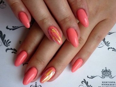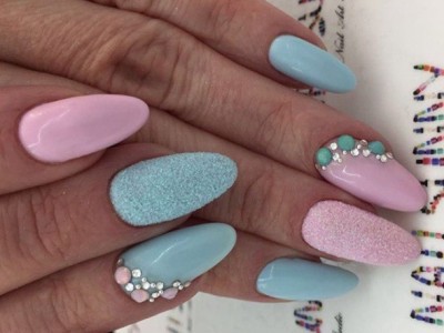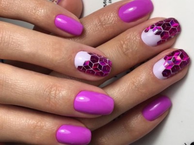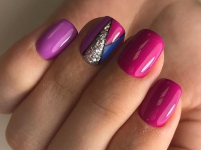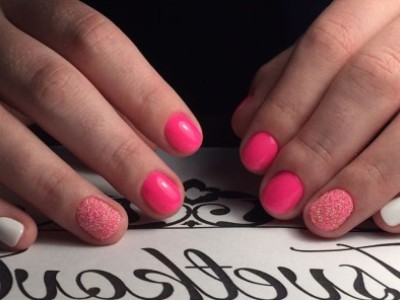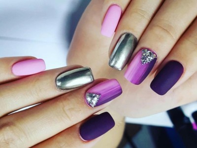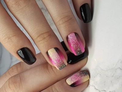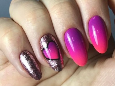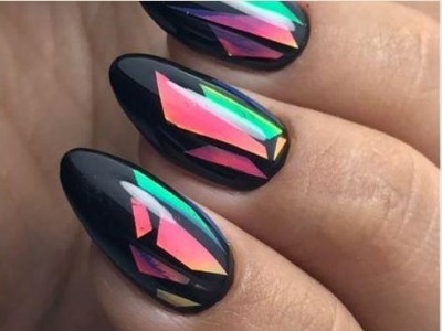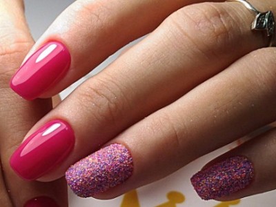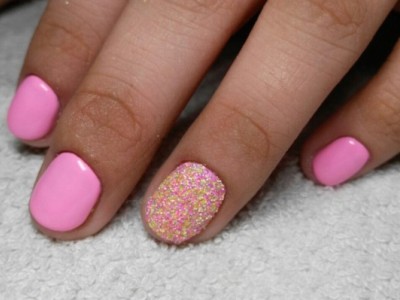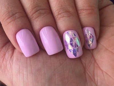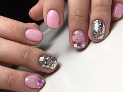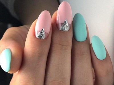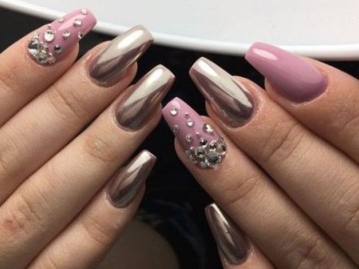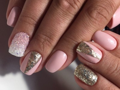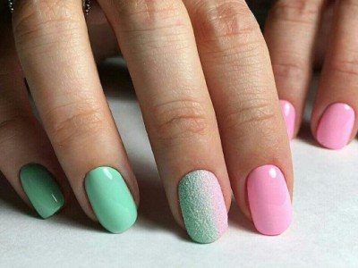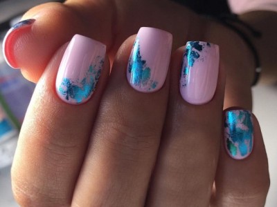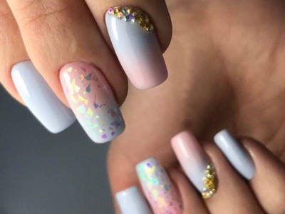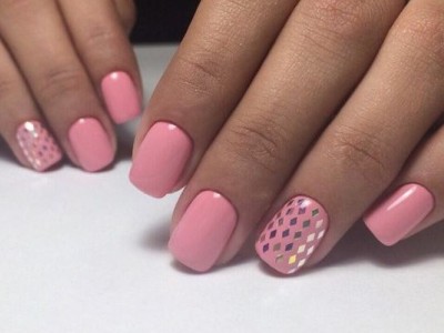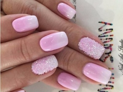Нейл-арт з осколками сьогодні вважається одним з найбільш динамічно розвиваються напрямків в манікюрі. І з рожевим лаком «бите скло» чудово гармонує. Блікує крихкість прекрасна і на коротких нігтики, і на довгих різної форми. Основа буває однотонною, а градієнтні переходи змушують грати техніку по-новому. Спробуйте зробити рожево-зелений градієнт, як на фото, і в зоні затемнення наклеїти «осколки».
