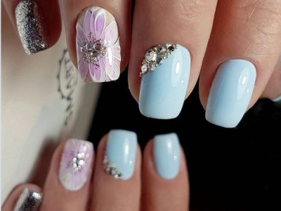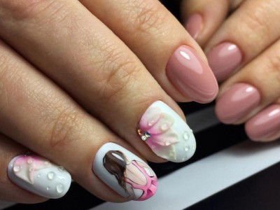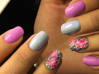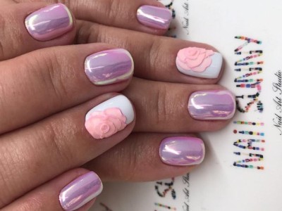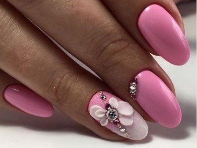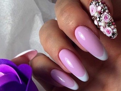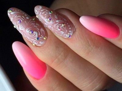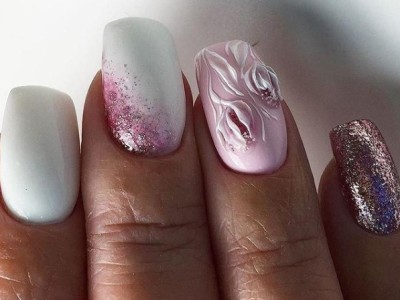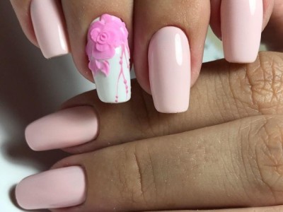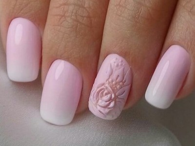 У звичайному житті така краса буде тільки заважати, але на весілля, випускний і в інший особливий день ліплення на жіночих коготках тримається на першому місці! Арт цей дуже складний і самостійно ви його навряд чи подужаєте, адже доведеться один за іншим викладати гелем пелюстки, а потім їх з’єднувати воєдино. Але майстри примудряються творити неймовірні, як живі квіткові композиції, тому ні в якому разі не відмовляйтеся від такого арту. Він – витвір мистецтва! Для різноманітності і більшого ефекту на ліпленні використовуйте інші кольори. Гарні на рожевому блакитний, червоний, помаранчевий, зелений тони. Ну і класика – біла база та рожеві квіти на ній.