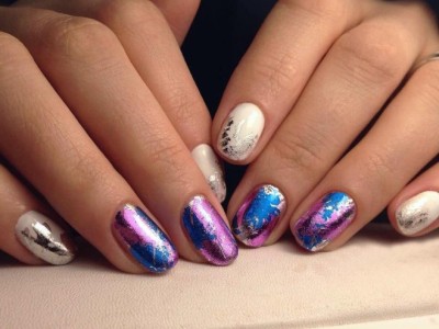 Особливий пігмент вигідний тим, що його можна наносити по-різному. Розкішно виглядають шматочки слюди на основі кольору фуксії. Не менш стильною буде блискуча синя слюда на лососевої основі. Не бійтеся поєднувати палеві відтінки з великими пластівцями – сріблястими, фіолетовими, зеленими, золотими… Чорна база і яскраво-рожеві юкі на ній – трохи зухвала, але від того не менш стильне поєднання.