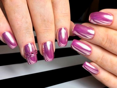 Відомо, що спеціальна втирочная пил змінює колір і інтенсивність сяйва в залежності від підкладки. Якщо ви хочете отримати красивий відтінок «рожеве золото», то накладайте пігмент на рожевій гамі. І навіть тут насиченість має значення. Чим більш яскравий і насичений колір ви вибираєте, тим «рожевого» вийде хром. Але не обов’язково робити втирку на всіх пальчиках. Покрийте пластини, приміром, ліловим лаком, а поруч на чорну базу втирайте пил. Результат приголомшливий. Багатий арт і уособлення стилю в одному флаконі!