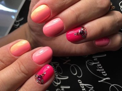 Вся краса рожевого розкривається в його змішуванні з іншими квітами. З’єднайте рожевий з жовтим, блакитним, червоним, білим, помаранчевим і милуйтеся всмак на гру тонів. Неймовірно ніжний, чуттєвий і вишуканий перехід гарантує захоплені охи і ахи оточуючих. Ви і самі будете постійно ловити себе на милуванні відтінками. Віддайте себе в руки досвідченого майстра і красуйтесь з професійною роботою на коготках. Зрозуміло, ніхто не завадить вам з’єднувати омбре з іншими нейл-варіаціями, а тільки похвалить за ініціативу.