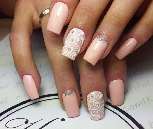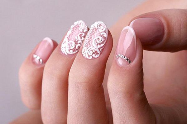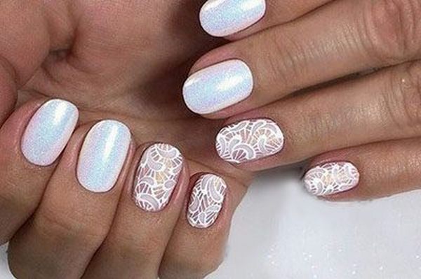 Чудові луки в ошатному і розкішному варіанті можна красиво доповнити модним манікюром з мереживом, що буде бездоганний в цьому тандемі. Не обійтися без ажурного дизайну нігтів і у весільному образі нареченої.