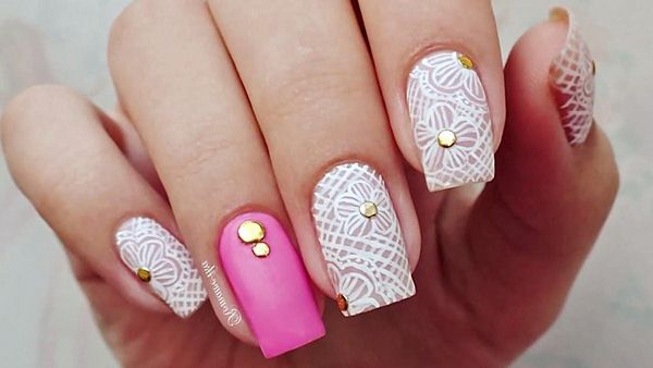 Виконати модний манікюр з мереживом 2019-2020 роки фахівці манікюрної справи пропонують за допомогою таких технік, як розпис і малювання ажурних візерунків, стемпинг і з допомогою клеящегося мережива.