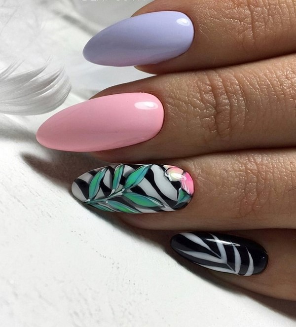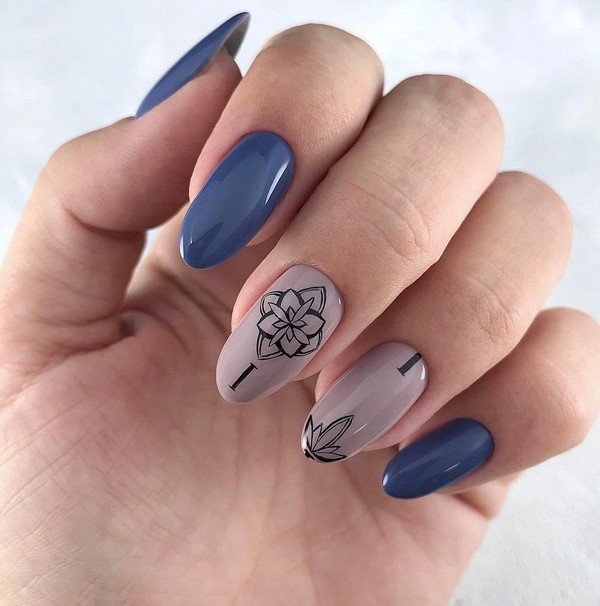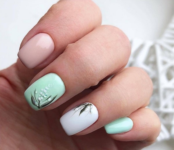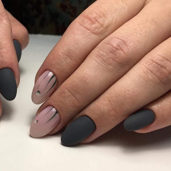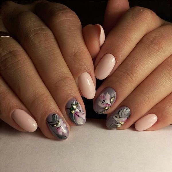 Більш ніжний мінімалістичний нейл-дизайн у флористичному виконанні можна отримати з пастельній палітрою гель-лаків і тілесними відтінками. А ось гранично демократичний квітковий манікюр 2019-2020 для кожного сезону можна виконати з сіро-чорною і біло-бежевою колірною гамою.