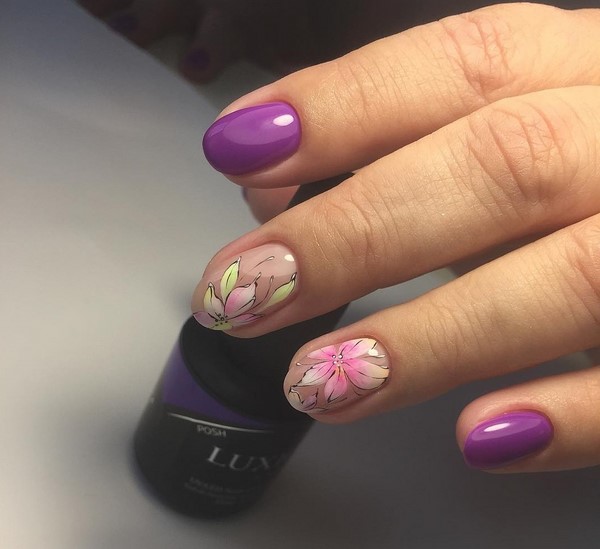 Красиві прозорі малюнки з квітами виконуються найтоншим пензлем із застосуванням палітри різних відтінків лаків, покроково прорисовуючи кожна квітка і завиток, отримуючи дивовижної краси милий квітковий дизайн нігтів 2019-2020.