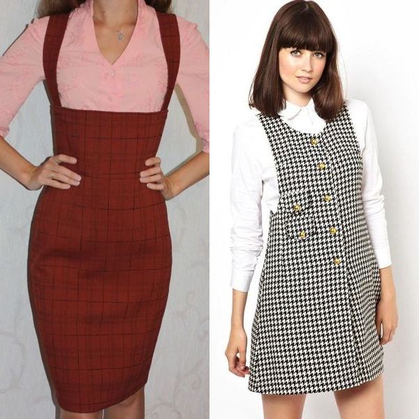 Сукні, сарафани, як і строгі ділові сарафани можна носити нічого не надягаючи вниз, але доповнюючи образ жакетом або кофтою на гудзиках.
